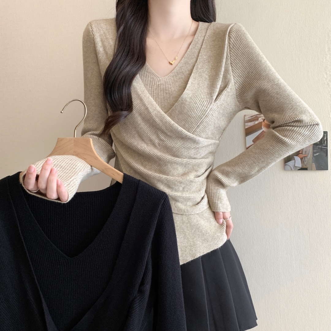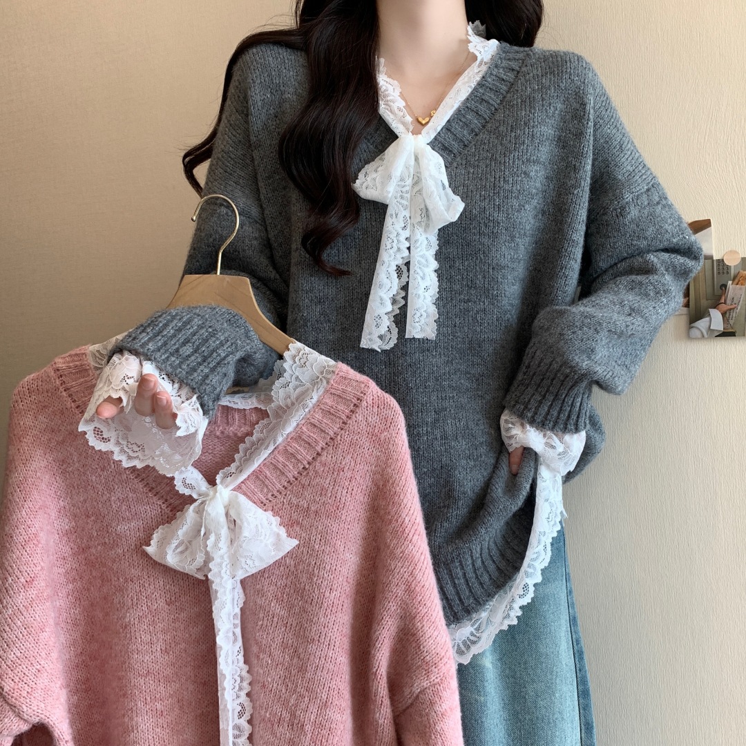 大きいサイズの婦人服2024秋冬のデザイン感のレースはvネックのセーターをつづり合わせてゆったりしています。