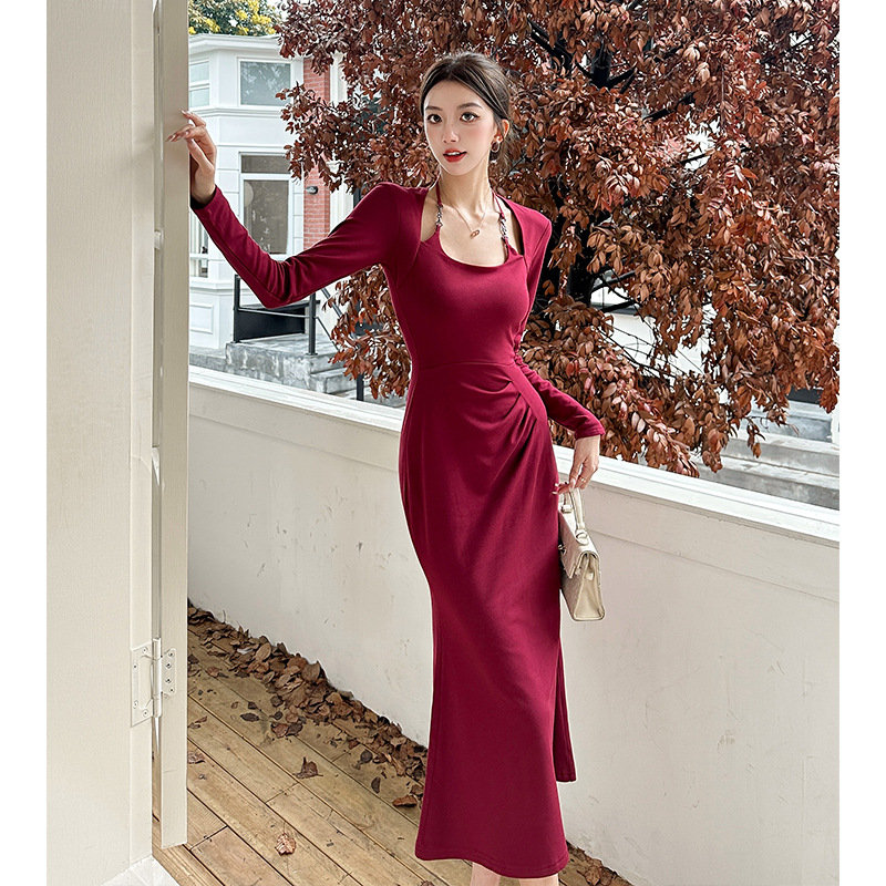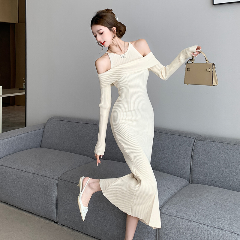 セクシーな肩の長袖のニットのワンピースの女性の2024秋冬の高級感の魚の尾の長いスカートは底の中でセーターのワンピースを掛けます。