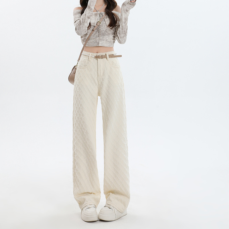 白い腰の高いワイドパンツの女性2024秋の新しいゆるいジャカード生地のデニムのストレートパンツの垂直感の長いズボン