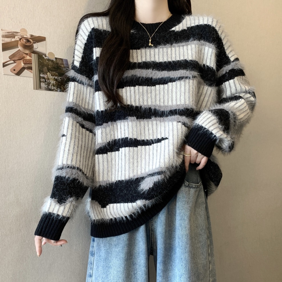 韓系の怠惰な風のストライプのセーターの女性の2024秋冬の新型はゆったりしていて痩せています。