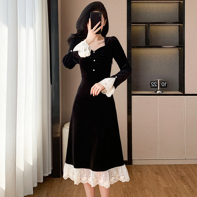 フランスの名媛レースの縁のつなぎ合わせのワンピースの女性の2024秋冬の新型のヘボン風の黒色のベルベットのドレスのスカート