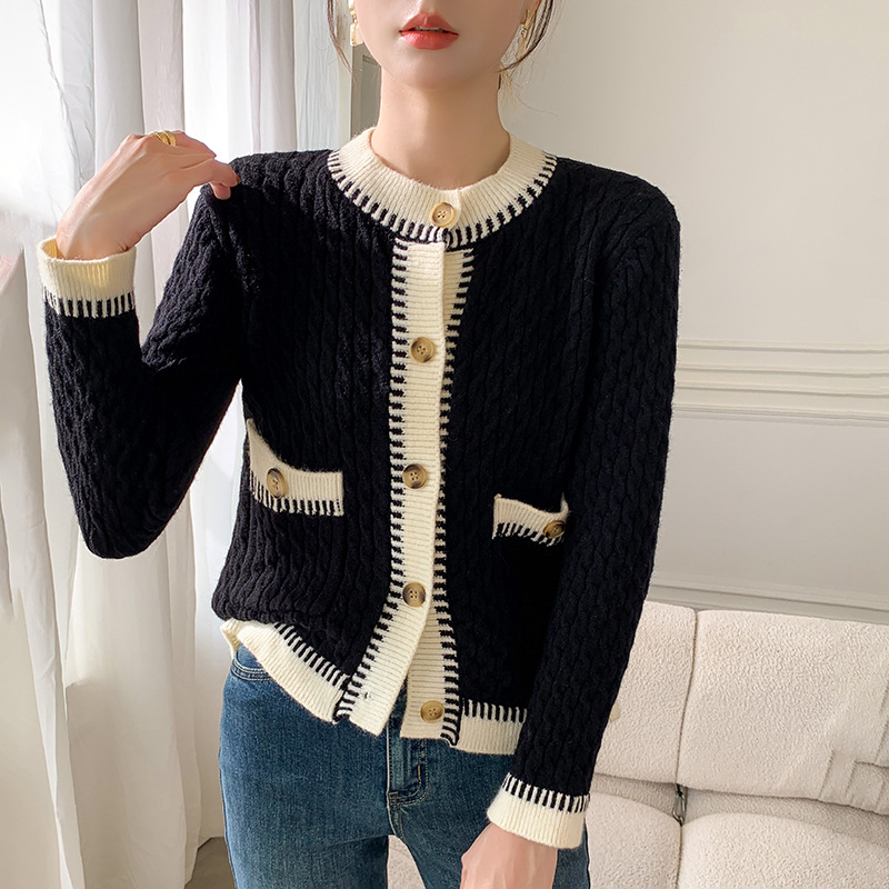 ファッション的な雰囲気の色合わせの丸首ニットのカーディガンの女性2024秋冬の新型の長袖の短いセーターの上着