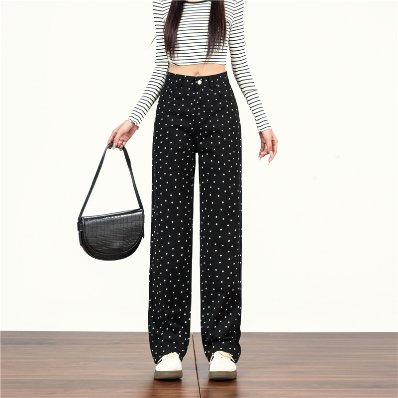 2024秋冬の新型波点デニムの長ズボンの女性韓国版の高腰のゆったりしている百合のカジュアルなまっすぐな筒の広い足のモップのズボン