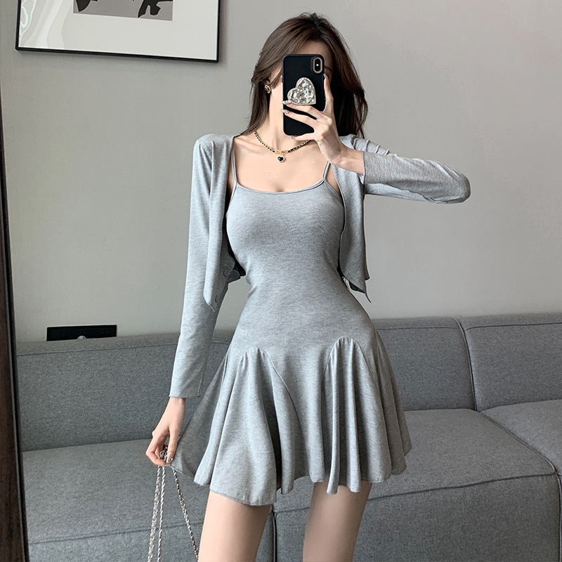 2024秋の新しい優しい風セクシーな純粋なストラップのワンピースのカーディガンのコートの気質は腰の短いスカートのスーツを収めます。