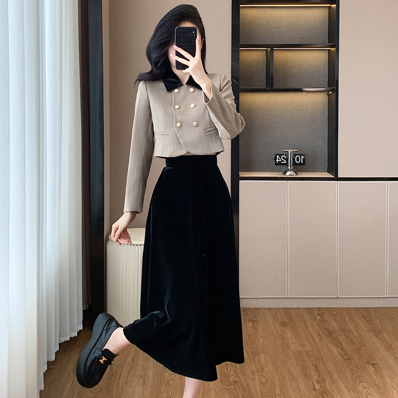 2024秋冬の新型フランスの名媛気質の小さい香風のコートの黒いベロアの半身のスカートのファッションはやせているスーツを現します。
