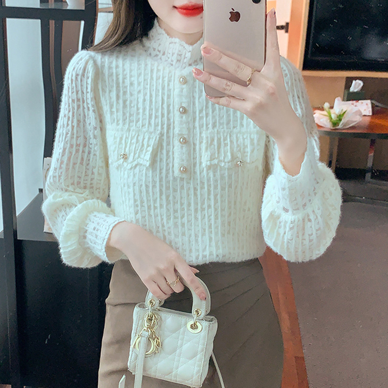 フランスの名媛の小さい香りの風のレースのシャツの女性の2024秋冬の新型のシンプルなファッションの小さい大衆の杏色の底の上着