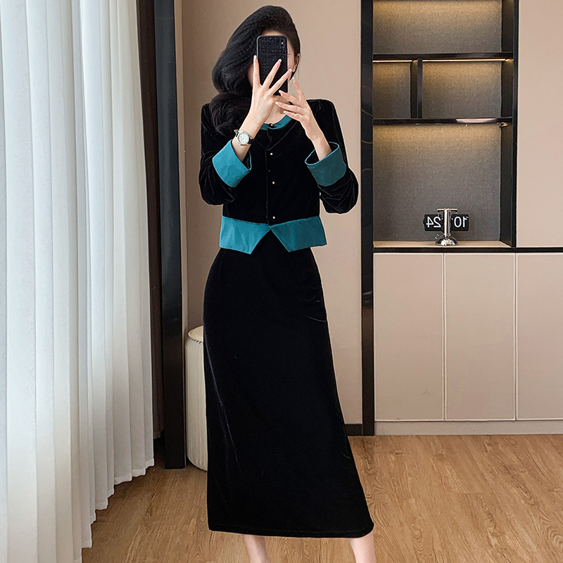フランスの名媛の小さい香風のワンピースの女性の2024秋冬の新型のヘボン風の気質のベロアの小さい黒いスカートのドレス