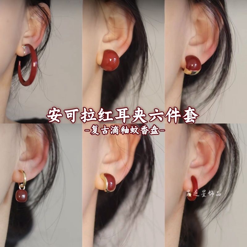 爆発的な赤いフランス式蚊取り盤耳クリップ新型秋冬耳穴なしイヤリング復古シンプル高級気質耳飾り