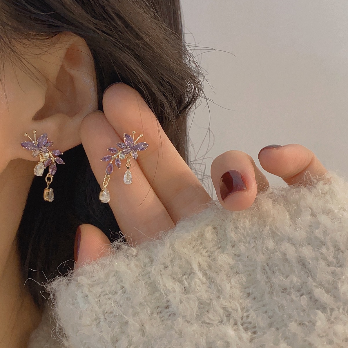 フランスの軽い豪華な紫色のジルコンの蝶の水滴のフリンジのピアスの小さい大衆の設計感の精巧なイヤリングの卸売りの女性