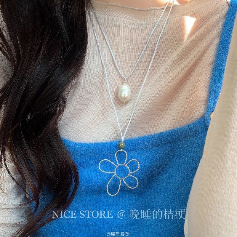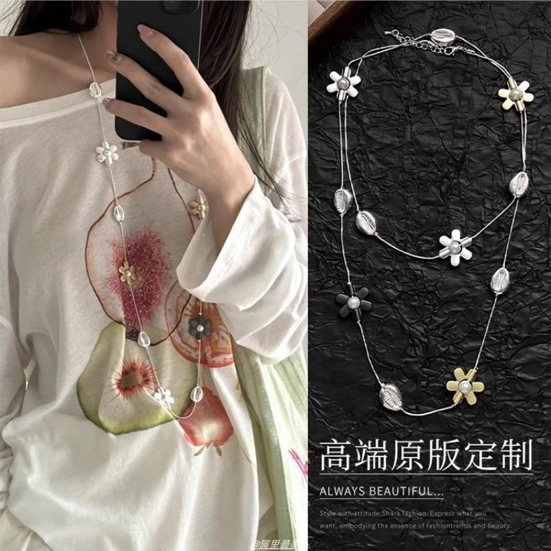 ニッチなインスタイルのメタルコントラストフラワーステッチロングネックレス韓国スタイルの多用途パーソナライズされたスタックセーターチェーンアクセサリー