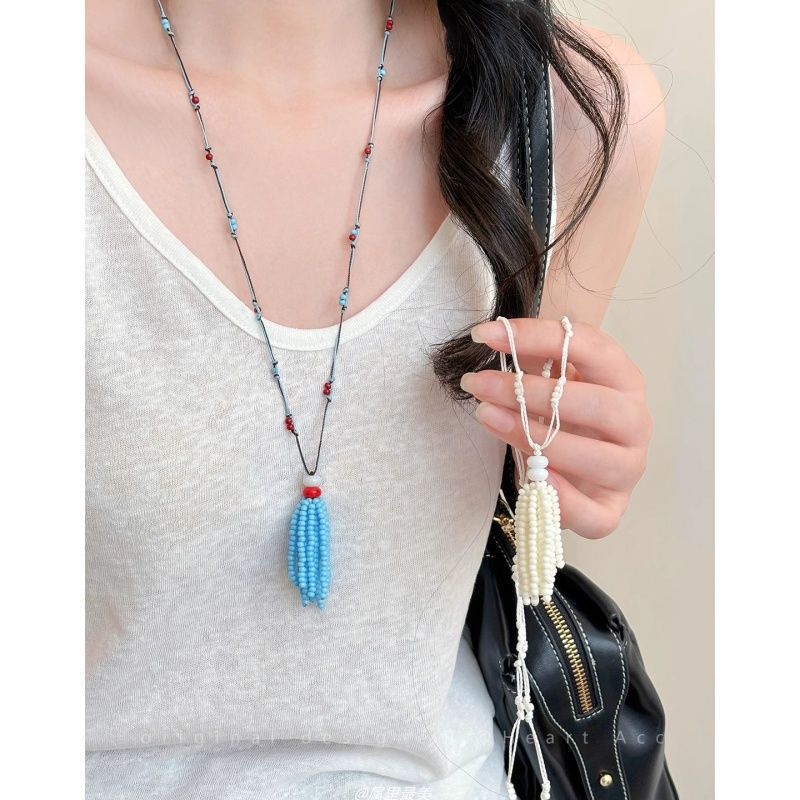 女性用の青いビーズタッセル編み込みネックレス、ニッチでユニークなデザイン、ロングセーターチェーン、夏のアクセサリーに最適