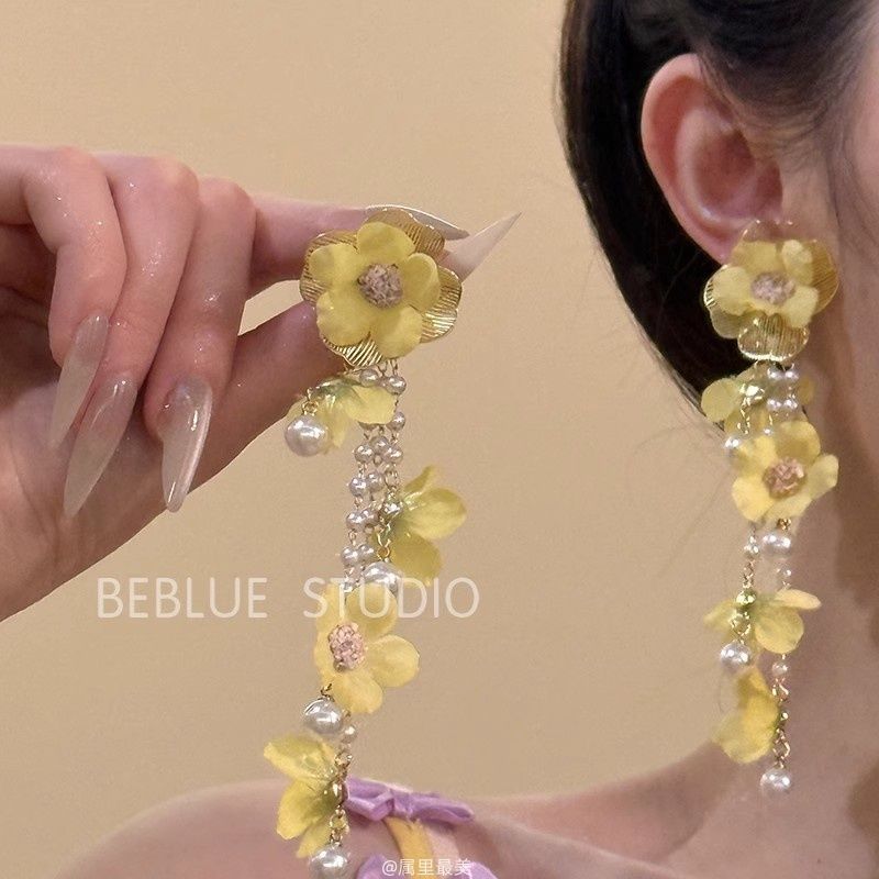 初朝の花が咲く〜春夏の気質黄色の花のイヤリング2025新しいリゾートスタイル誇張されたパールイヤリング