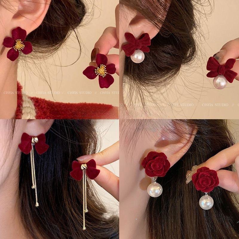 2024新型ベルベット花イヤリング高級感軽贅沢ピアス気質高級大気秋冬赤色ピアス女