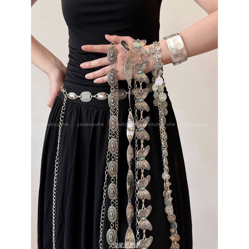 ボヘミアンエスニックスタイルターコイズバタフライウエストチェーンレディースニッチデザインハイエンドスカート装飾ベルト付き