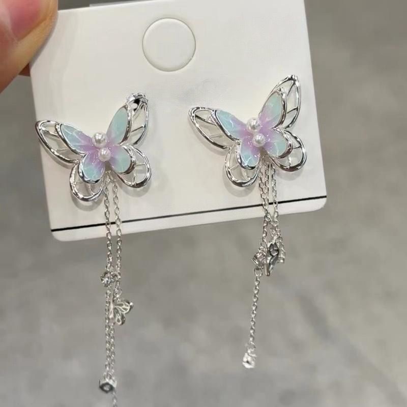 紫色の蝶のイヤリングの小さい大衆の気質のフリンジのイヤリングの2024の新型の爆発の銀の針のイヤリングの女性の夏