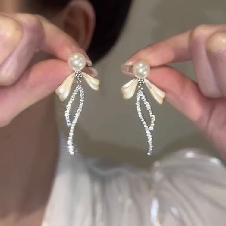 真珠の蝶結びのフリンジのイヤリングの女性の2024の新型の爆発のジルコンのイヤリングの軽い豪華な高級感の大衆の設計