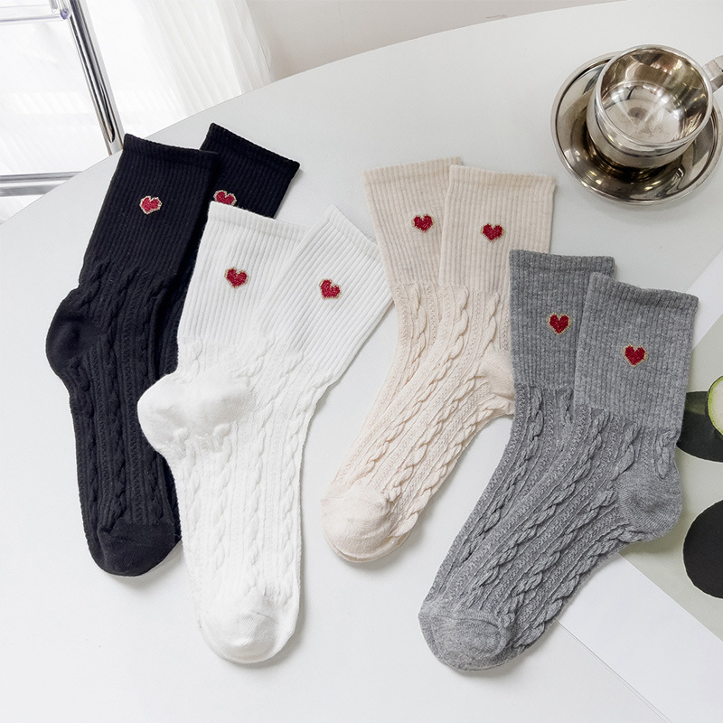 小ハート靴下春秋日系ハート型金糸愛綿靴下純色麻花ストッキング運動中筒靴下女