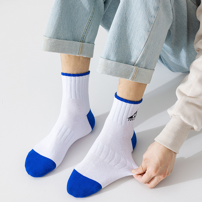 靴下男ins潮春夏ソックス青と白の色合わせ刺繍目の中筒靴下綿百合潮靴下運動潮