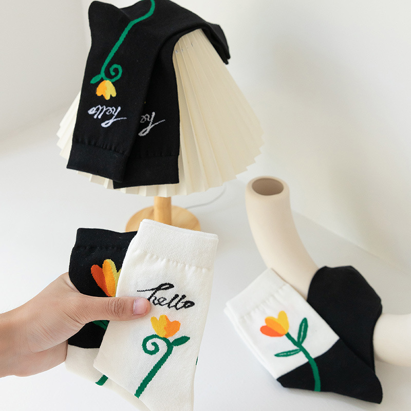 韓国秋冬新作ins潮花チューリップ中筒靴下子供黒と白の薄い花びらのつなぎ合わせ