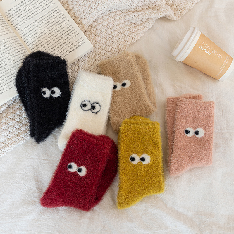 秋冬のぬいぐるみの靴下の男女のかわいい大きい目のミンクの毛の厚い保温の中筒の床板の靴下
