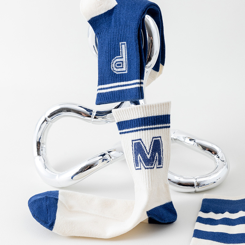 新型のアルファベットの中筒の靴下の潮流mpの女性の靴下の青い太い紋様のストッキングの女性の純綿の靴下