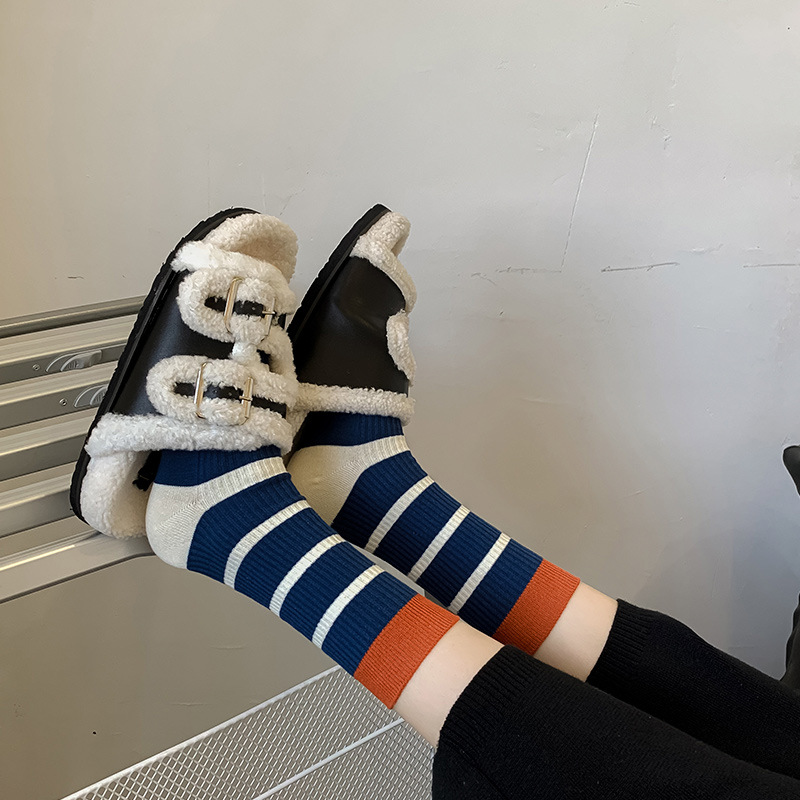 2022秋冬新作ダブルピン刺繍靴下カラー突色ストライプミディアムソックスレディースinsファッションコットンソックス