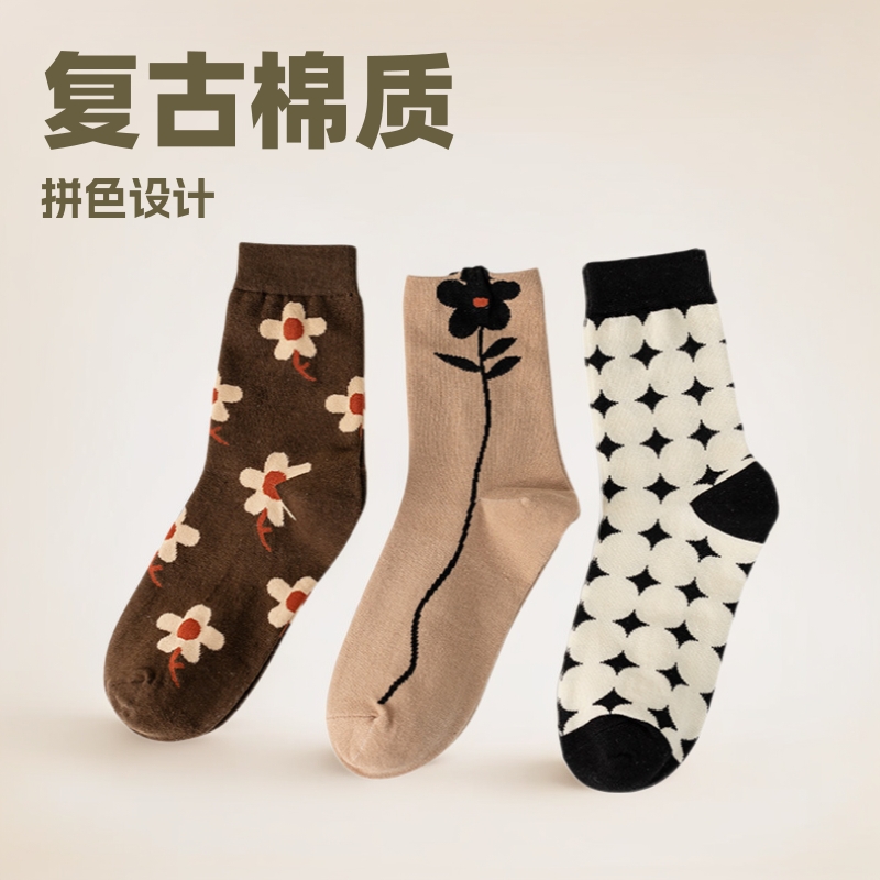 韓国系のレトロな口調の木の葉の花の純綿の中筒の山の靴下の森系の色合わせの女性の靴下のコーヒー色の綿の靴下