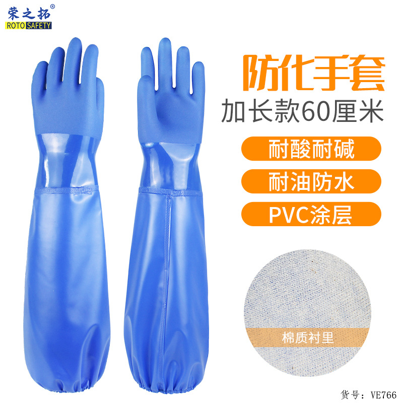 防水ブルーpvc手袋を長くして、耐油性酸アルカリ漁水産滑り止めプラスチック労働保護手袋を厚くする