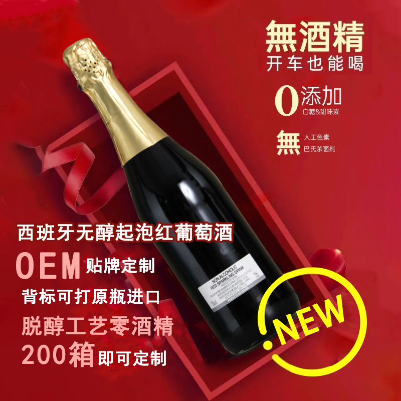 オリジナルボトル輸入OEM OEMカスタマイズスペインノンアルコールスパークリングワインシンプルラベルワイン0度脱アルコールプロセス赤ワイン