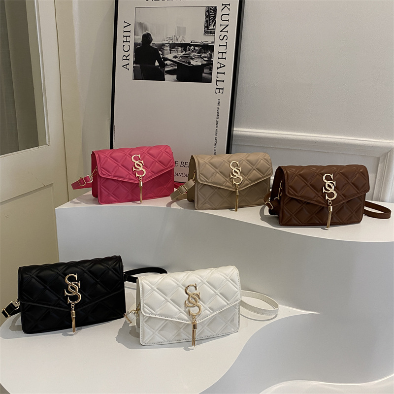 新しい女性バッグ2024気質ファッション洋気純色菱格清新な質感シングル肩斜めショルダーバッグ
