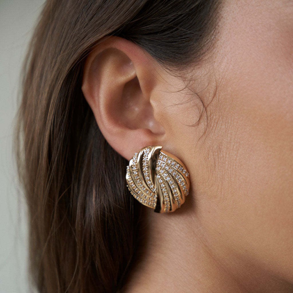 ヨーロッパとアメリカのファッショナブルな気質、シンプルな幾何学的なイヤリング、マイクロ象嵌ジルコン 18K ゴールドライト高級不規則なプリーツ扇形イヤリング