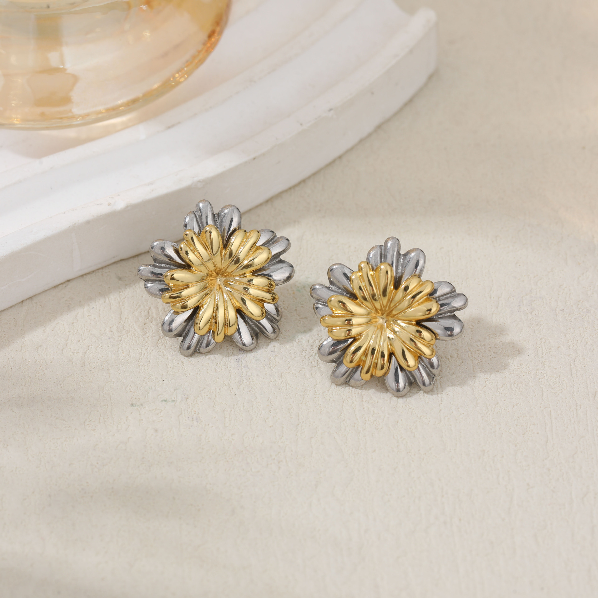 ヨーロッパとアメリカのクロスボーダーステンレス鋼レトロハイエンドゴールドとシルバーの混合色二層ひまわりイヤリングフェミニンファッションイヤリング