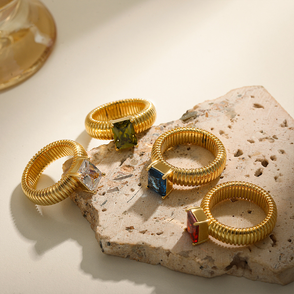 国境を越えた欧米風メッキ18k金復古小衆デザイン街頭幾何学縞モザイクカラージルコン指輪