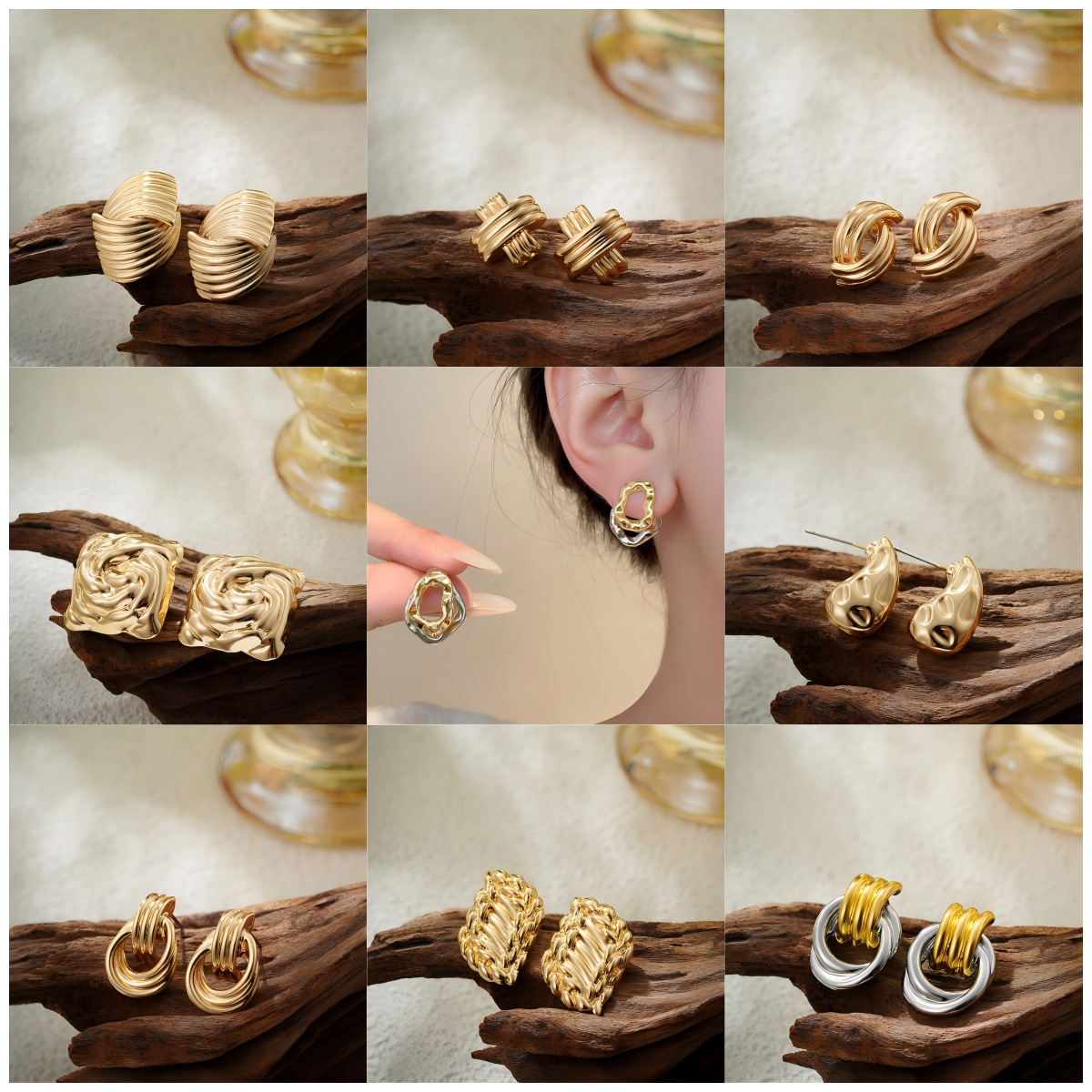欧米の国境を越えた質感ファッション個性高級感イヤリング中古風メッキ18k金の不規則な幾何学的耳飾り