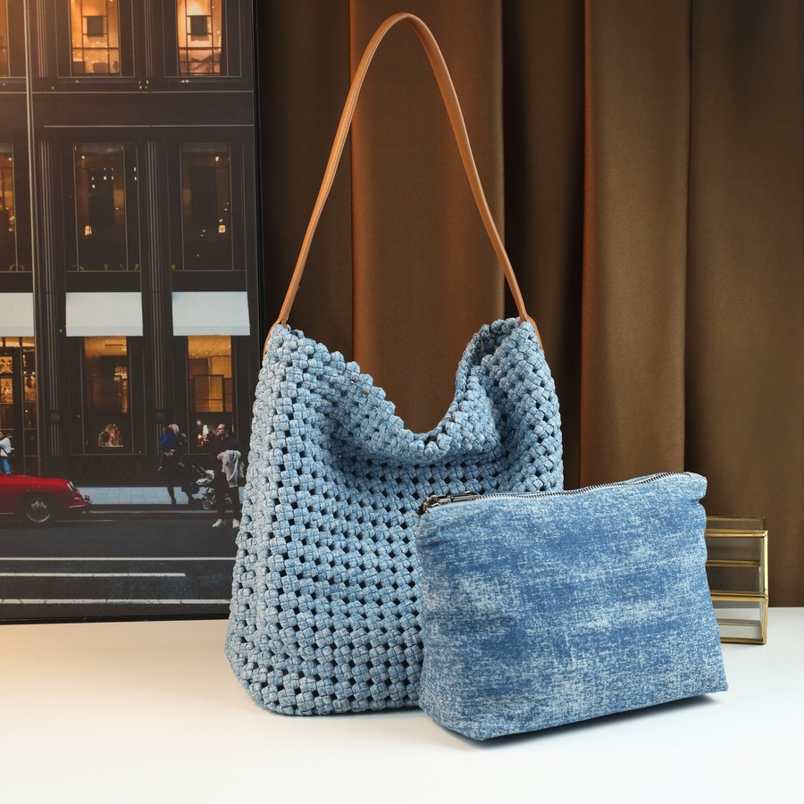 新款手工编织包尼龙布镂空包大容量水桶包休闲百搭子母包腋下包潮