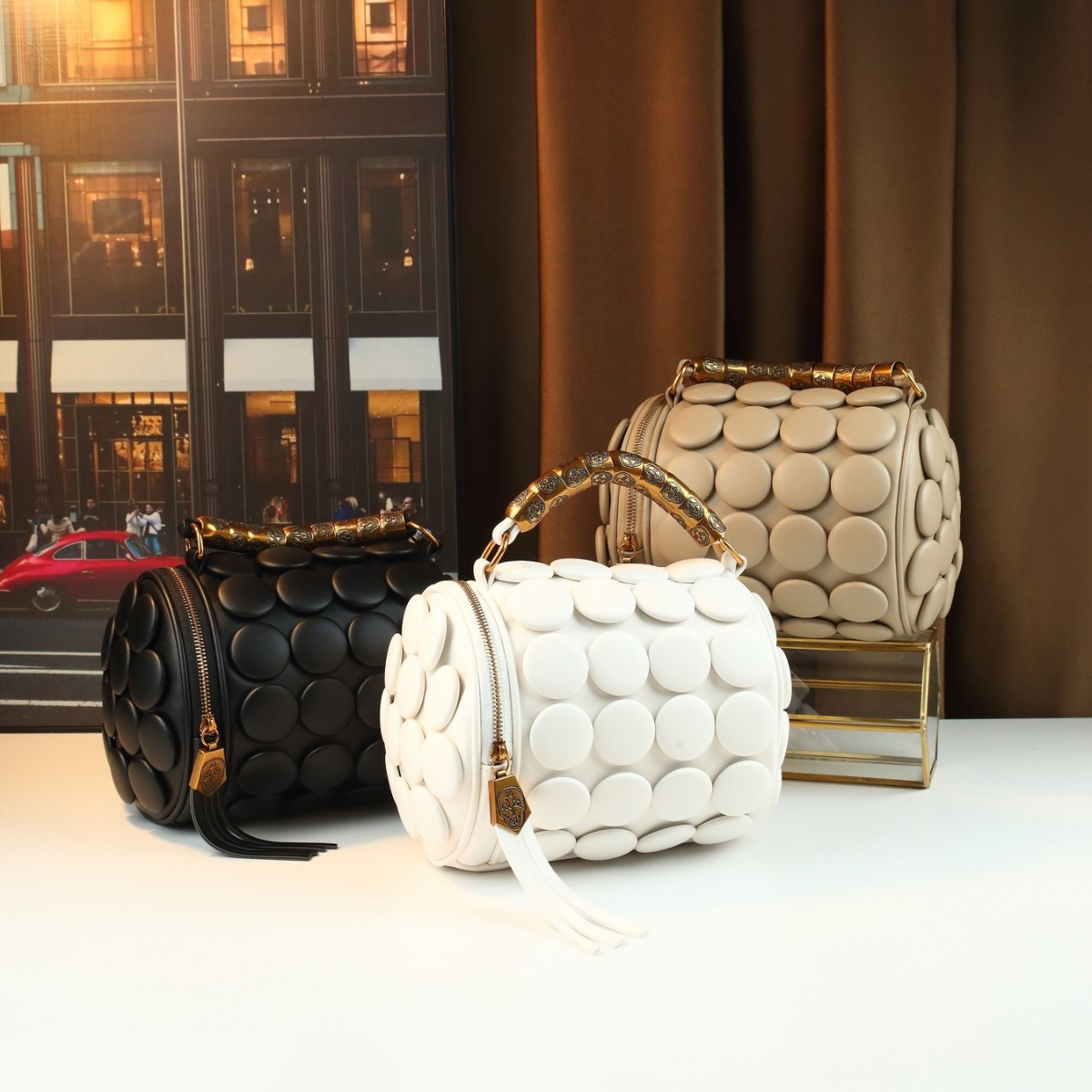 ボストン枕バッグ立体水玉装飾新しいシリンダーバッグ女性のショルダーメッセンジャーバッグレトロボタンハンドバッグ