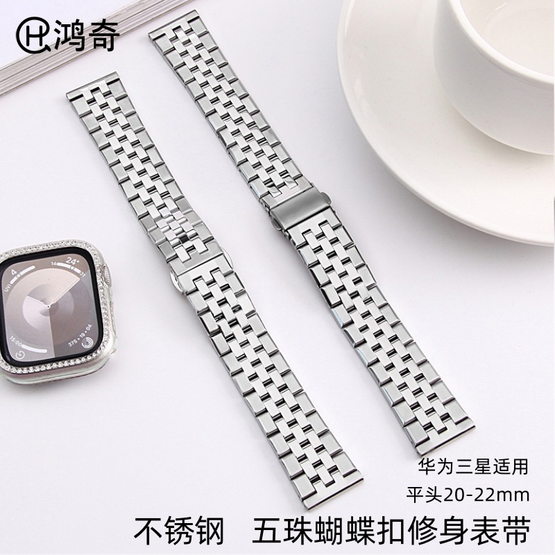 Huawei GT5 Samsung ウォッチスマートウォッチに適したソリッドステンレススチールバタフライバックル 5 ビーズメタルクイックリリース男性