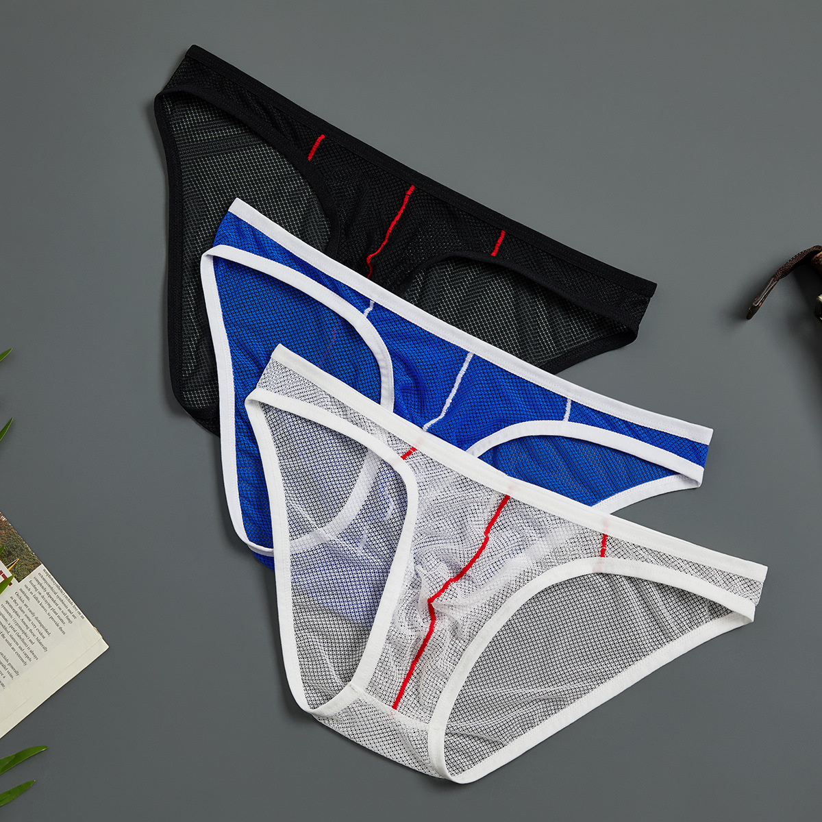 男性の下着のセクシーな二丁のズボンの網の穴の純色の高叉の情緒の清涼とした通気性の大きい袋の透かし彫りの男性の丁のズボン