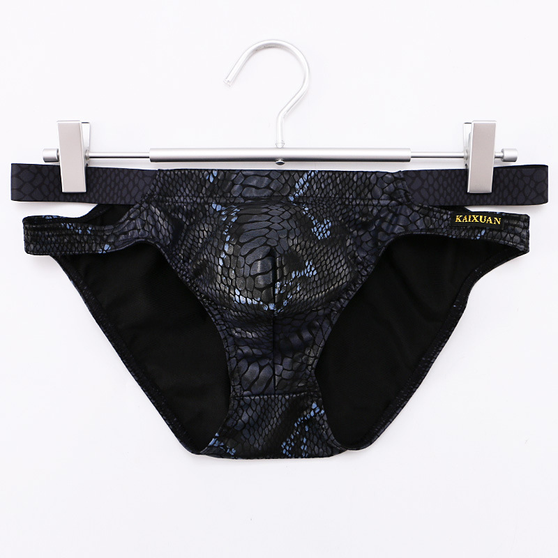 速売通男性下着低腰セクシーな透かし彫り三角ズボンは蛇の皮の大きい袋のu凸ビキニのパンツの男をまねます。