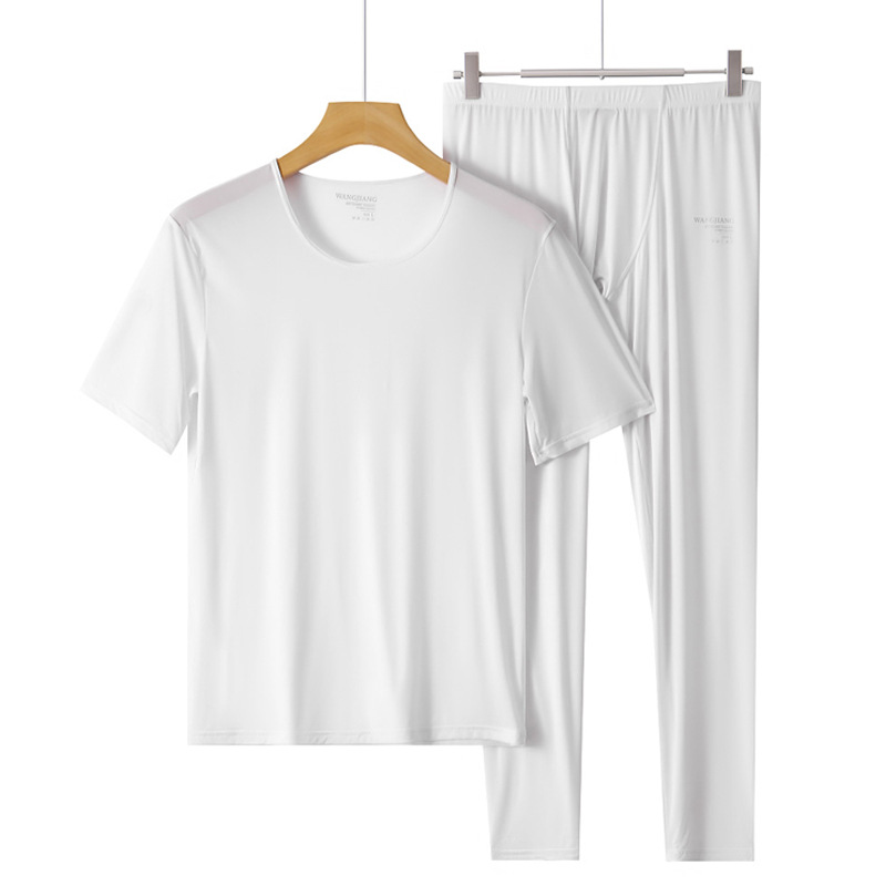 男性の家の服の氷糸の底のシャツの透明なシルクの滑りの通気性の薄い高弾の運動の半袖のtシャツ + ズボンのスーツ