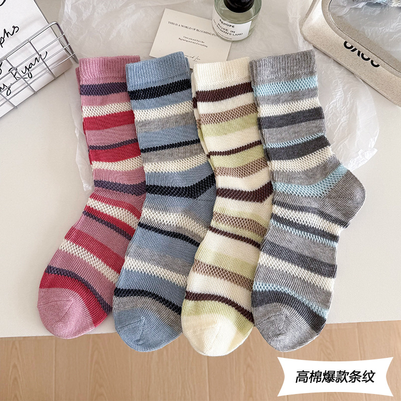 靴下の女性綿の春夏の薄いストライプの爆発的な女性の中筒の靴下の骨がないファッションの靴下の透かし彫りのネットの目の靴下の卸売り
