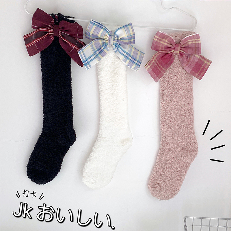 サンゴの毛の靴下の秋冬の新型のjkの格子の蝶結びのサンゴの毛の足の靴下の毛の足の靴下の保温の靴下の卸売り