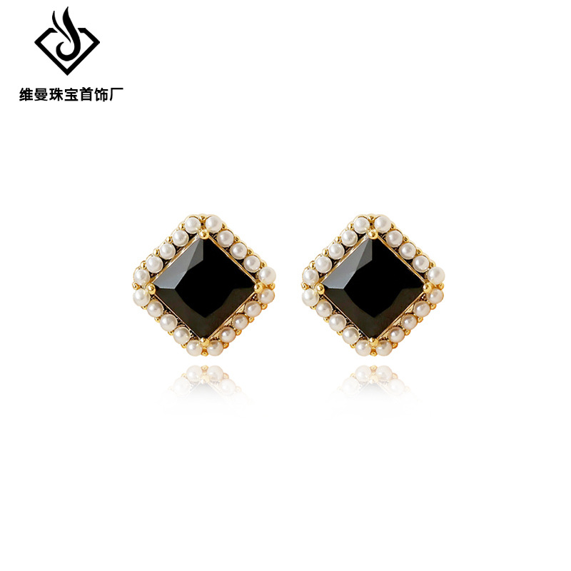 フランスのレトロな四角い真珠のイヤリングの女性の軽い豪華な大衆の設計の高級感の黒瑪瑙のファッションの気質のイヤリングの装飾