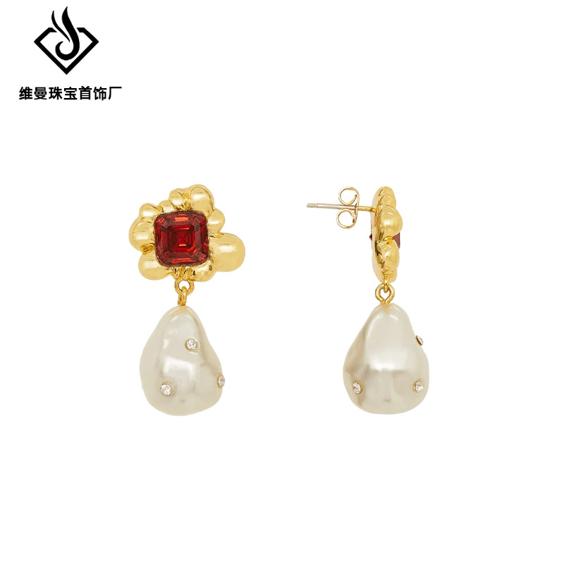 張紫寧同項流金方ドリル真珠ピアス女性軽贅沢高級デザイン感復古気質赤イヤリング飾り