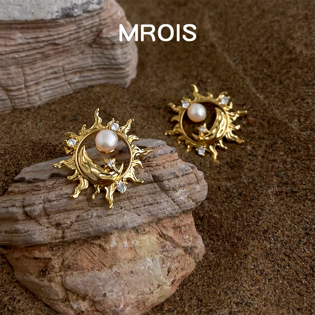 日月·オリジナル厚金メッキ18K本金淡水パールジルコンイヤリング ヴィンテージ風アーティスティックライトラグジュアリー925シルバーピアス
