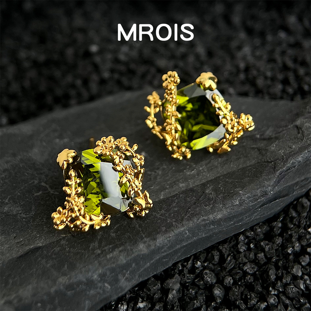 オリジナル厚メッキ18k真金オリーブグリーンジルコン花ピアス軽贅沢フランスつるs925銀針耳飾り女