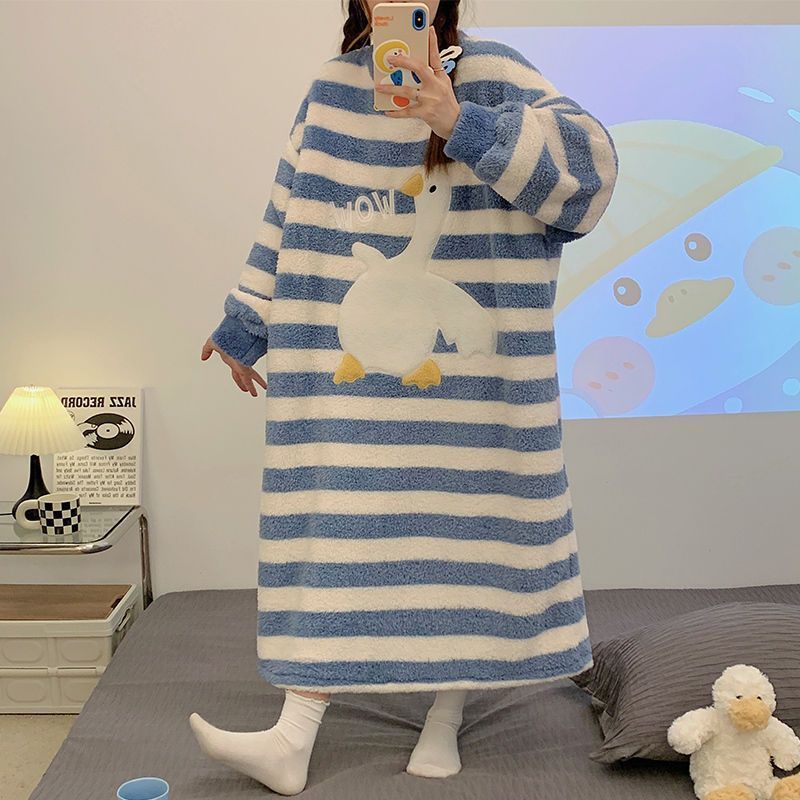 韓国版秋冬新作パジャマ女性フランネル丸首ストライプ漫画ロングスカートコーラルベルベットホームウェア卸売