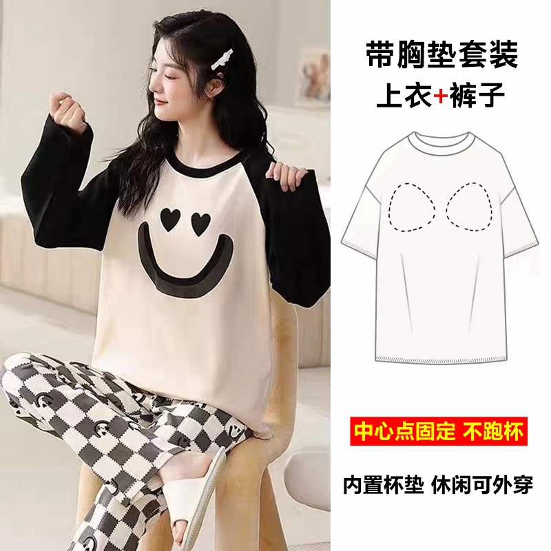 パジャマの女性の秋の綿の胸のパッドの一体式の長袖のスーツの春秋のタイプのカジュアルな女性の大きいサイズの部屋の服
