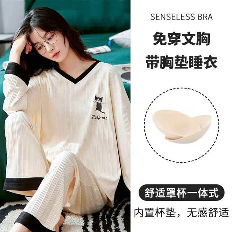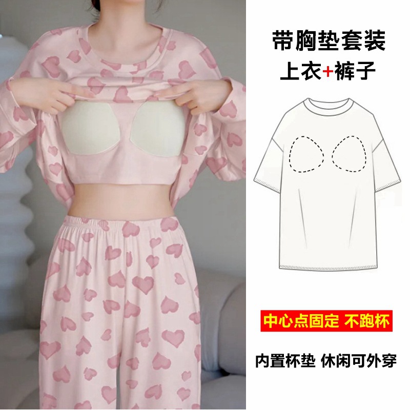 パジャマ女性の秋の長袖セットは胸パッド付き一体型2024年の新しいサイズは春秋冬の家の服を着ることができる