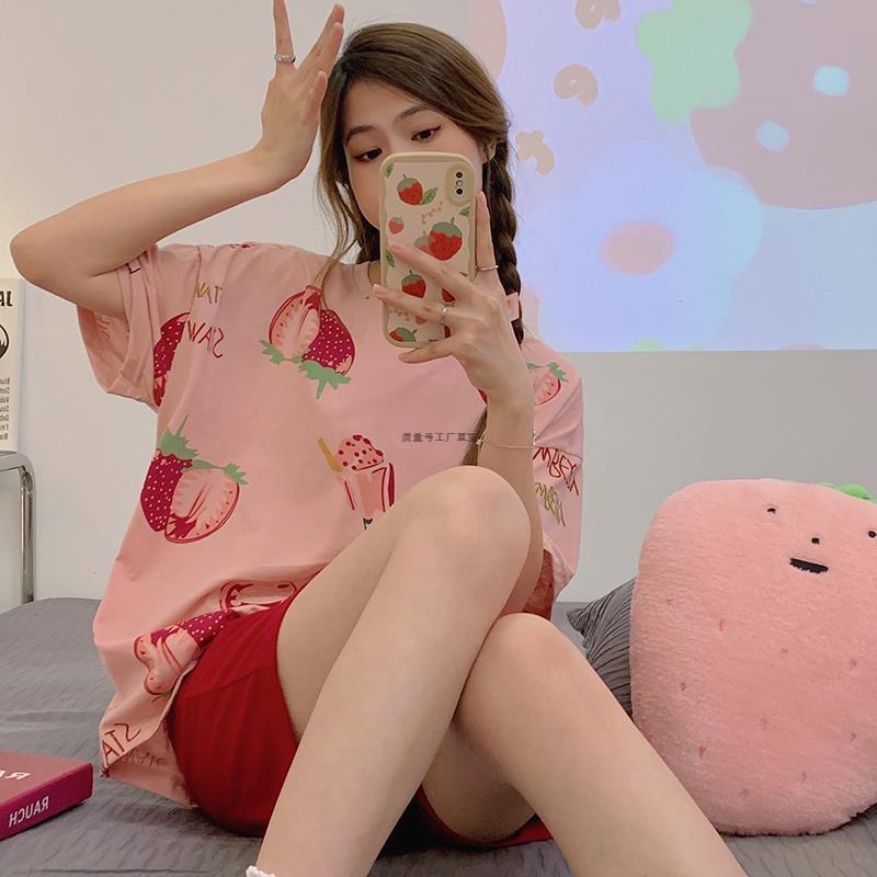 夏のパジャマの女性の半袖の半ズボンの韓国版の甘くてかわいい丸首のゆったりしている大きいサイズの家の服の2つのセットは外に着ることができます。
